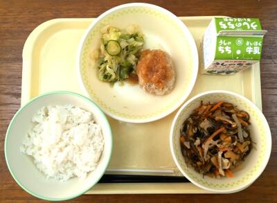 【本日のメニュー】 ハンバーグのおろしソースかけ、鶏肉と昆布の炒り煮、ピリッとキャベツ、ごはん、牛乳