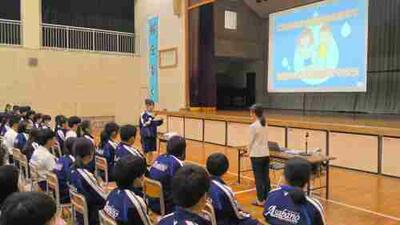 4月23日(水)、外部指導者を招聘し、体育館を会場に全校生徒対象の『熱中症予防教室』を実施しました。指導者は、昨年度に引き続き、meiji(明治)の東京本社に所属する管理栄養士の井口 芽実 先生。『みんなは大丈夫?見直そう!水分補給』というタイトルで授業をしてくださいました。〇人間のカラダと水分、〇水分不足の危険サイン、〇なぜ水分不足が熱中症に?、〇熱中症になりやすい環境を予防、〇上手な水分の摂り方、〇熱中症になった時の段階的応急手当、等、時にはクイズも交えながら、分かりやすくご指導くださいました。『自分の命は、自分で守る』。生徒たちは真剣に授業に臨んでいました!