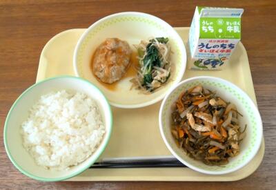 【本日のメニュー】照り焼きハンバーグ、おひたし、豚肉と昆布の炒め煮、ごはん、牛乳