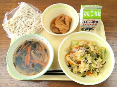 今年度初めてのうどん。油揚げの甘辛味が醤油ベースのお汁とうどんにマッチングして食欲をそそりました。豚肉と野菜の香味炒めとともに、今日も美味しくいただきました。