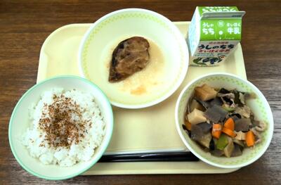 本日は、生徒たちに大人気の「照り焼きハンバーグ」。調理員さんたちが、丹精込めて一つ一つ具材を手で捏ねて作る手作りハンバーグ。照り焼き味でご飯との相性はばっちり!甘辛味の豚肉と昆布の炒め煮とともに、今日も美味しくいただきました。