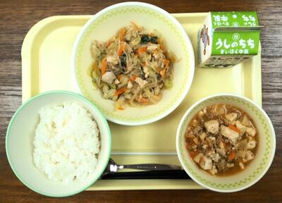 【本日のメニュー】 麻婆豆腐、チンゲン菜と白滝の炒め物、ごはん、牛乳