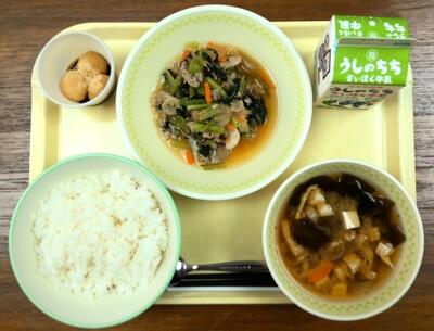 【本日のメニュー】 豚丼、味噌汁、白玉餅の黒蜜かけ、牛乳