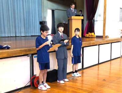 今回の生徒朝会では、新旧生徒会役員が合同で行い、旧生徒会役員からは、『制服の正しい着こなし方』についてスライドを使い、改めて確認をしました。新生徒会役員から、『来年度からリニューアルする体育着の紹介と着こなし方』について説明がありました。熱中症対策も兼ねて、従来の体育着と違う点は、より通気性や速乾性がある素材を使用していること、白色から色が変わったこと、学年枠を超えて着ることができるなど、わかりやすく説明してくれました。生徒はもちろん、保護者の皆様にも事前のアンケートにご協力いただき有難うございました。従来の体育着と併用できますので、ご理解・ご協力をお願いします。
