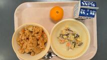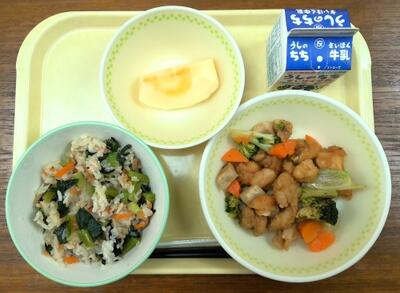 【本日のメニュー】 きび入り青菜ごはん、冬野菜の揚げ煮、りんご、牛乳