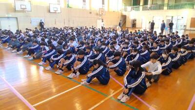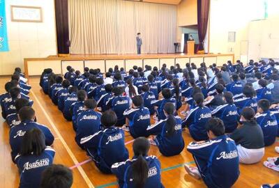 本日の生徒朝会では、3年生を送る会実行委員長よりスローガンの発表とともに、これまでお世話になった3年生に対する感謝の気持ちを込めて素晴らしい3年生を送る会を開催したいという願いが述べられました。また、生徒会長より冬休みの過ごし方やその後の学校生活に向けての浅中生としての心構えについての発表がありました。こうした集会でも開始5分前には整列・集合し、静かに待つ浅中生の姿は本当に立派です。