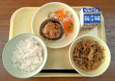 【本日のメニュー】 和風ミートカップ、切り干し大根の煮つけ、浅漬け、ごはん、牛乳