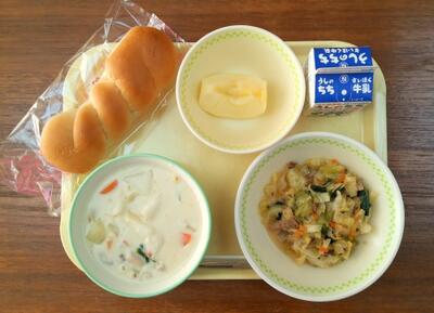 【本日のメニュー】 かぶのクリーム煮、キャベツとベーコンのソテー、ツイストパン、りんご、牛乳
