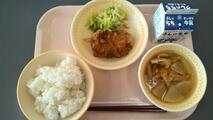 【本日のメニュー】 ミートペンネ、マセドアンサラダ、バターロール、牛乳
