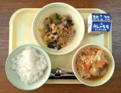 【本日のメニュー】 親子煮、青菜の中華炒め、ごはん、牛乳
