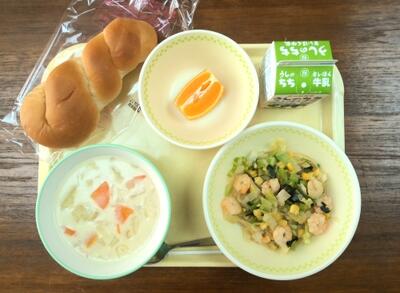 【本日のメニュー】 ホワイトシチュー、えびとコーンの炒め物、ツイストパン、清見柑、牛乳