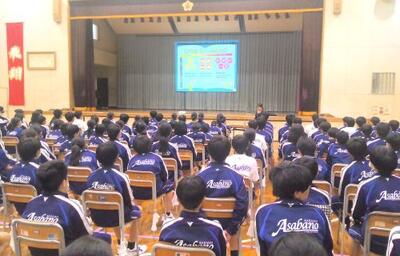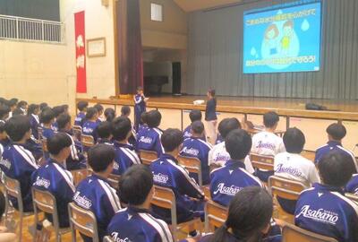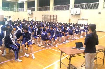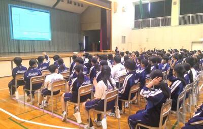 4月22日(水)、外部指導者を招聘し、体育館を会場に全校生徒を対象にして『熱中症予防教室』を実施しました。指導者は、本校4回目となる「meiji(明治)の東京本社に所属する管理栄養士の井口 芽実 先生。『みんなは大丈夫!?見直そう!水分補給』というタイトルで授業をしてくださいました。〇人間のカラダと水分量 〇水分不足の危険サイン 〇なぜ水分不足が熱中症に? 〇熱中症になりやすい環境 〇上手な水分の摂り方 〇熱中症になった時の段階的応急処置、等、クイズや生徒同士の話し合いも交えながら、分かりやすくご指導いただきました。『自分の命は、自分で守る』。浅中生たちは真剣に授業に臨んでいました!