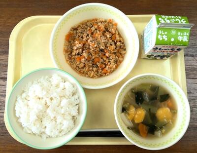 【本日のメニュー】 🌝『十五夜献立』 お月見団子汁、高野豆腐のそぼろ丼、牛乳