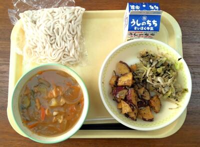 【本日のメニュー】 カレー南蛮、小魚入り大学芋、磯の香あえ、牛乳