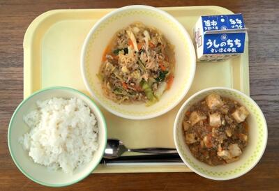 【本日のメニュー】 マーボー豆腐、キャベツと白滝の炒め物、ごはん、牛乳