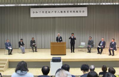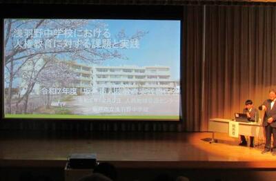 今年度、浅羽野中学校は坂戸市より人権教育推進モデル校として委嘱を受け、年間を通して人権教育に関わる様々な取組を行ってきました。本日『坂戸市人権教育実践報告会』が、市内学校だけでなく社会教育・PTA保護者等を一堂に会し大々的に開催されました。本校も代表校として取組に様子や成果と課題について発表することができました。