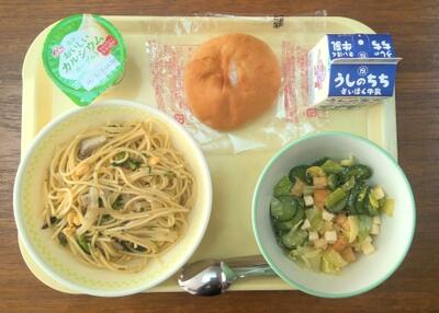 【本日のメニュー】 菜の花スパゲティ、シーザーサラダ、ライスボールパン、ヨーグルト、牛乳